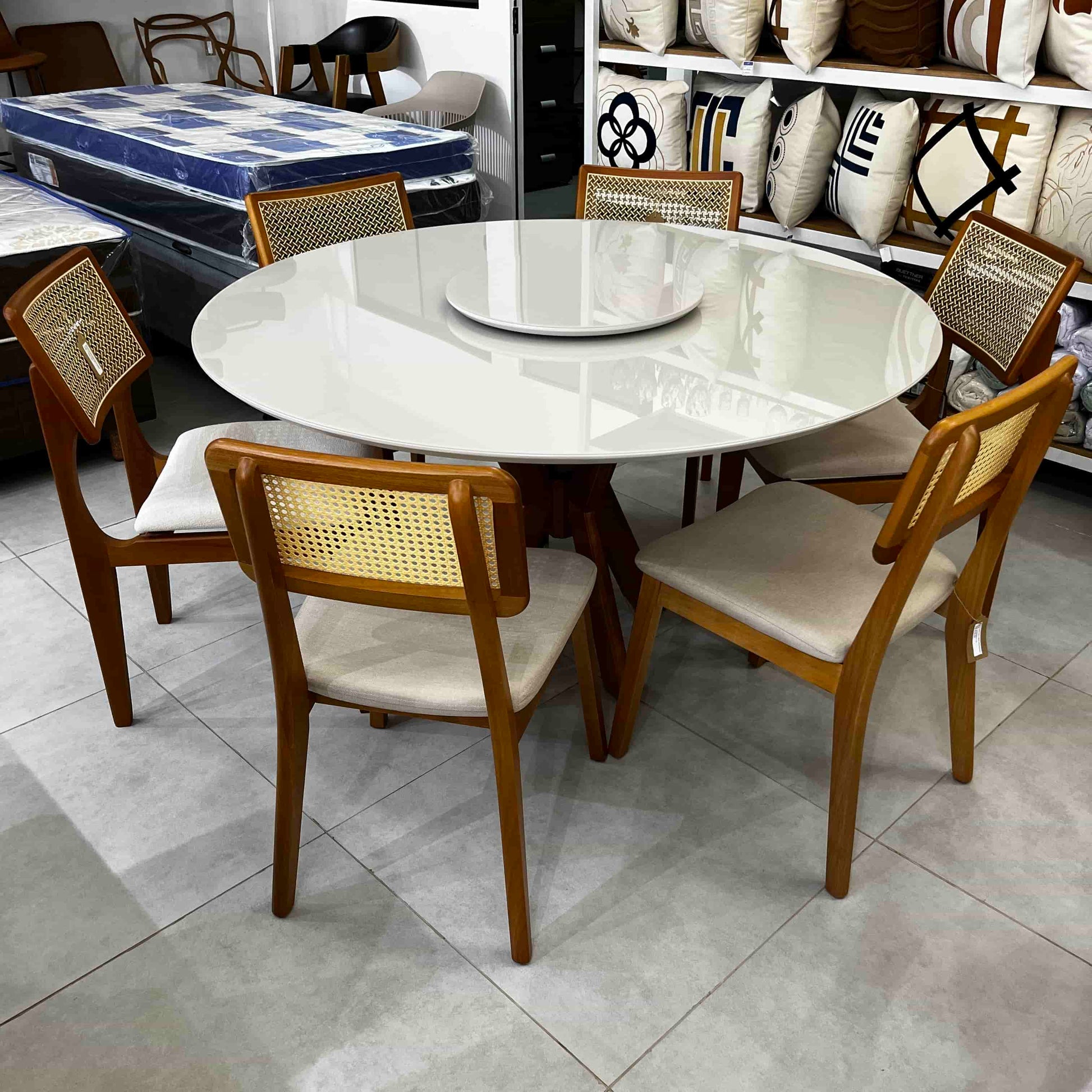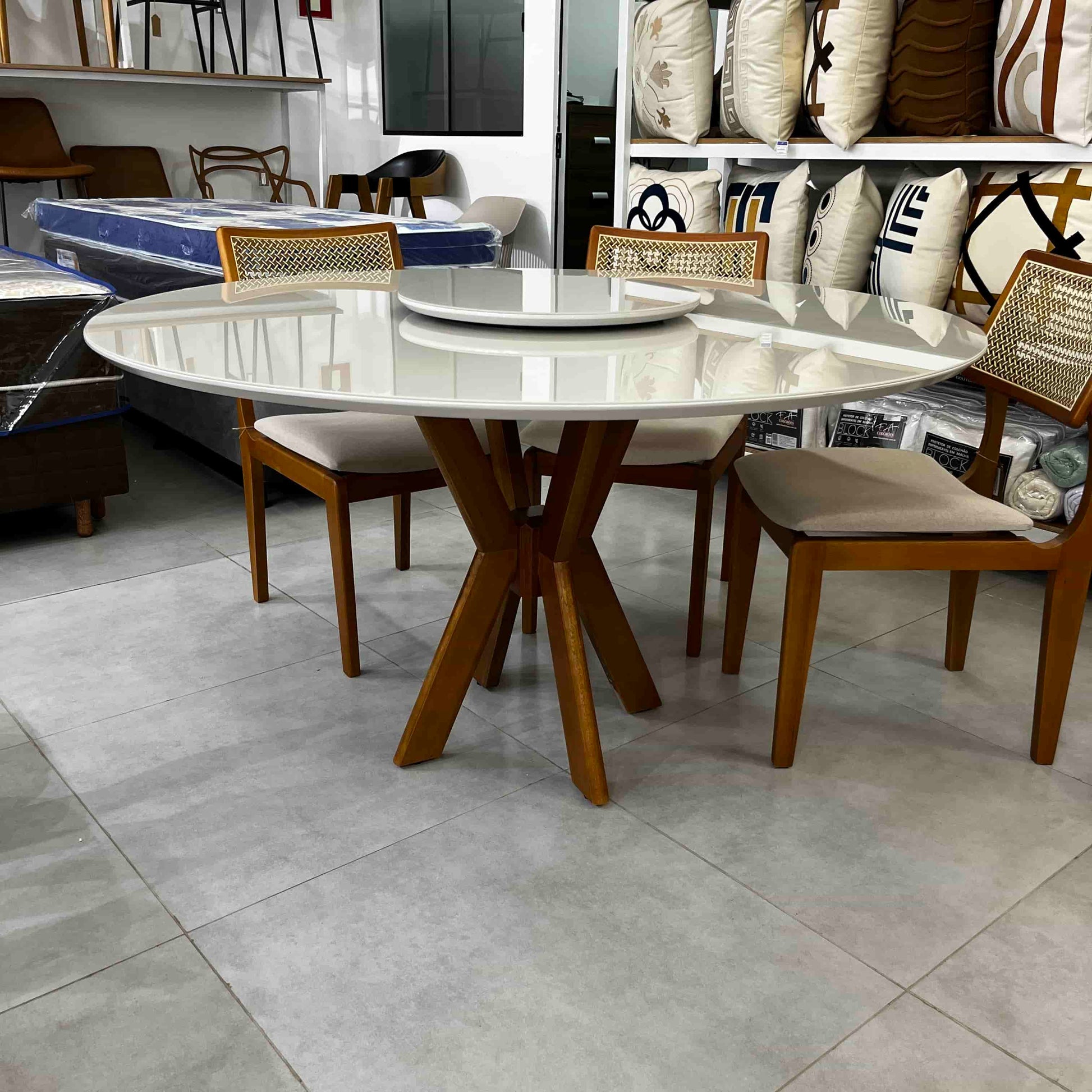 A Mesa Assunção é a união perfeita entre elegância e funcionalidade. Seu design sofisticado conta com estrutura em madeira e tampo de vidro off white, trazendo leveza e modernidade ao ambiente. O grande diferencial desta peça é a plataforma giratória central, ideal para facilitar a disposição de pratos e utensílios, tornando suas refeições ainda mais práticas e elegantes.