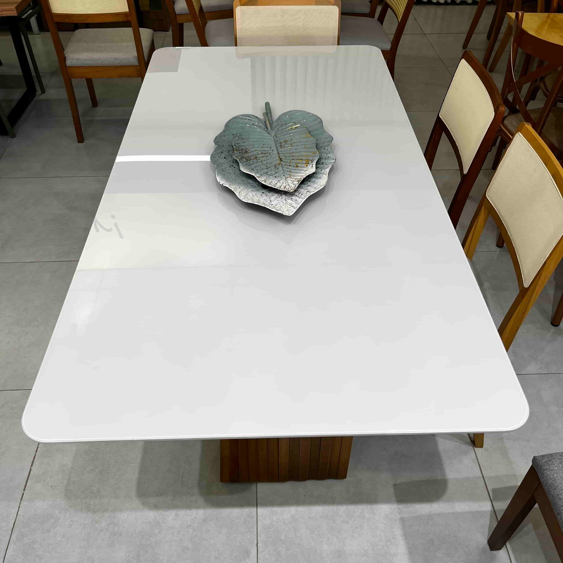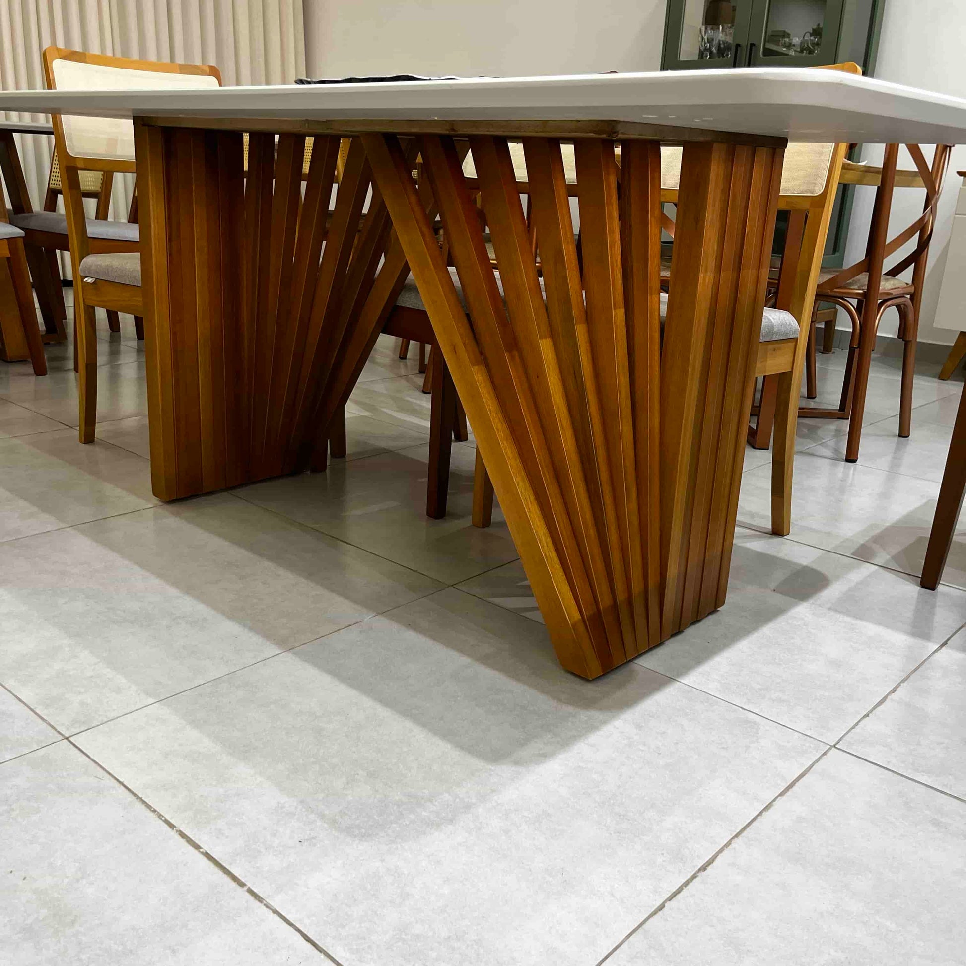 A Mesa Panamá une modernidade e sofisticação em um design exclusivo. Sua base geométrica em madeira maciça proporciona estabilidade e estilo, enquanto o tampo de vidro off white adiciona leveza e elegância ao ambiente. Perfeita para salas de jantar que buscam um toque contemporâneo e refinado.